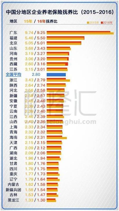 2017年,人社部發(fā)布《中國(guó)社會(huì)保險(xiǎn)發(fā)展報(bào)告2016》提及撫養(yǎng)比,全國(guó)平均是2.8,即每2.8個(gè)勞動(dòng)力(繳養(yǎng)老保險(xiǎn))要養(yǎng)一位老人。廣東的撫養(yǎng)比是9.25,位居全國(guó)第一 ,超出全國(guó)平均的只有8個(gè)省,而數(shù)據(jù)最低的是黑龍江,僅1.3 ,幾乎相當(dāng)于1個(gè)勞動(dòng)力養(yǎng)一位老人。